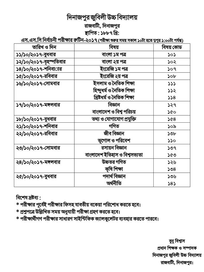 এস.এস.সি নির্বাচনী পরীক্ষার রুটিন-২০১৭ (পরীক্ষা শুরুর সময় সকাল ১০টা হতে দুপুর ১:০০টা পর্যন্ত)