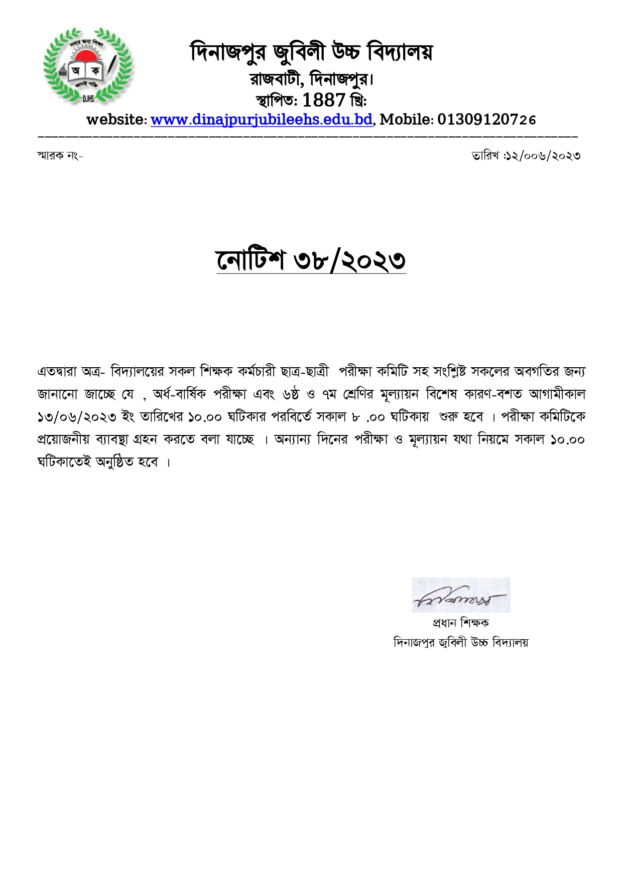 বিশেষ কারণবশত বিদ্যালয়ের পরীক্ষার সময়সূচী পরিবর্তন