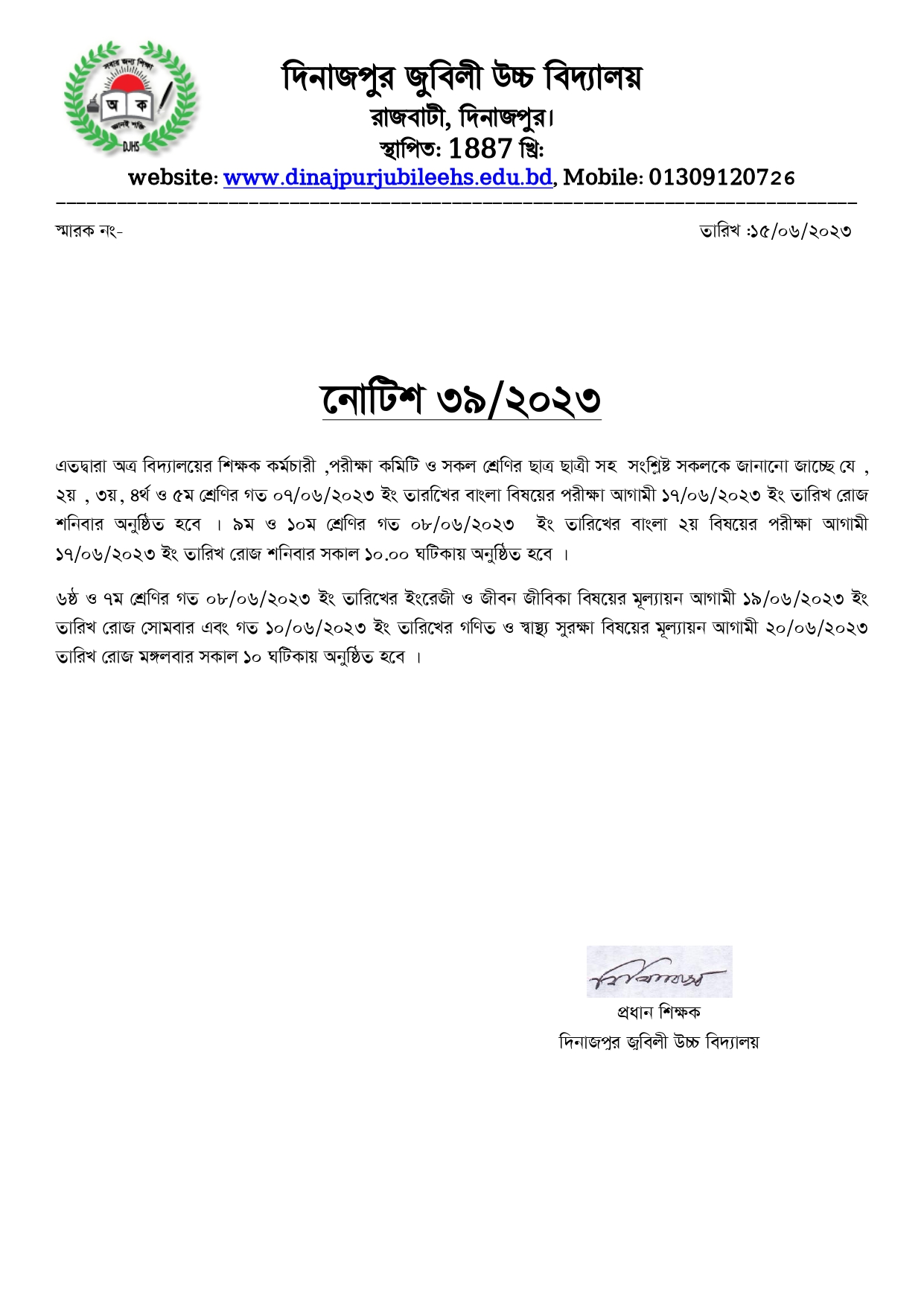 অবশিষ্ট বিষয়ের অনলাইন অর্ধবার্ষিক পরীক্ষার নোটিশ
