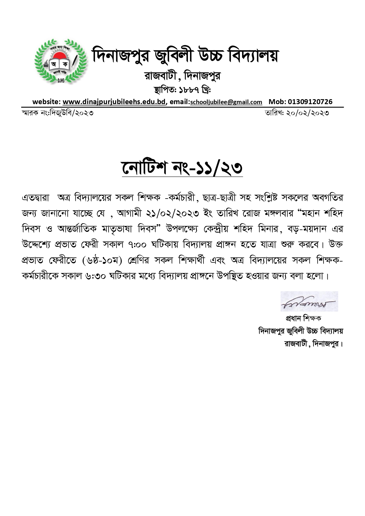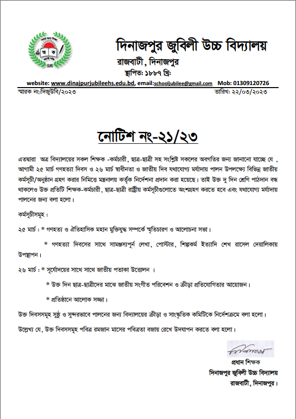 আগামী ২১ মার্চ,২০২৩ বার্ষিক ক্রীড়া প্রতিযোগিতার পুরস্কার বিতরণ অনুষ্ঠান, অভিভাবক সমাবেশ ও এসএসসি-২৩ পরীক্ষার্থীদের বিদায় অনুষ্ঠান অনুষ্ঠিত হবে।