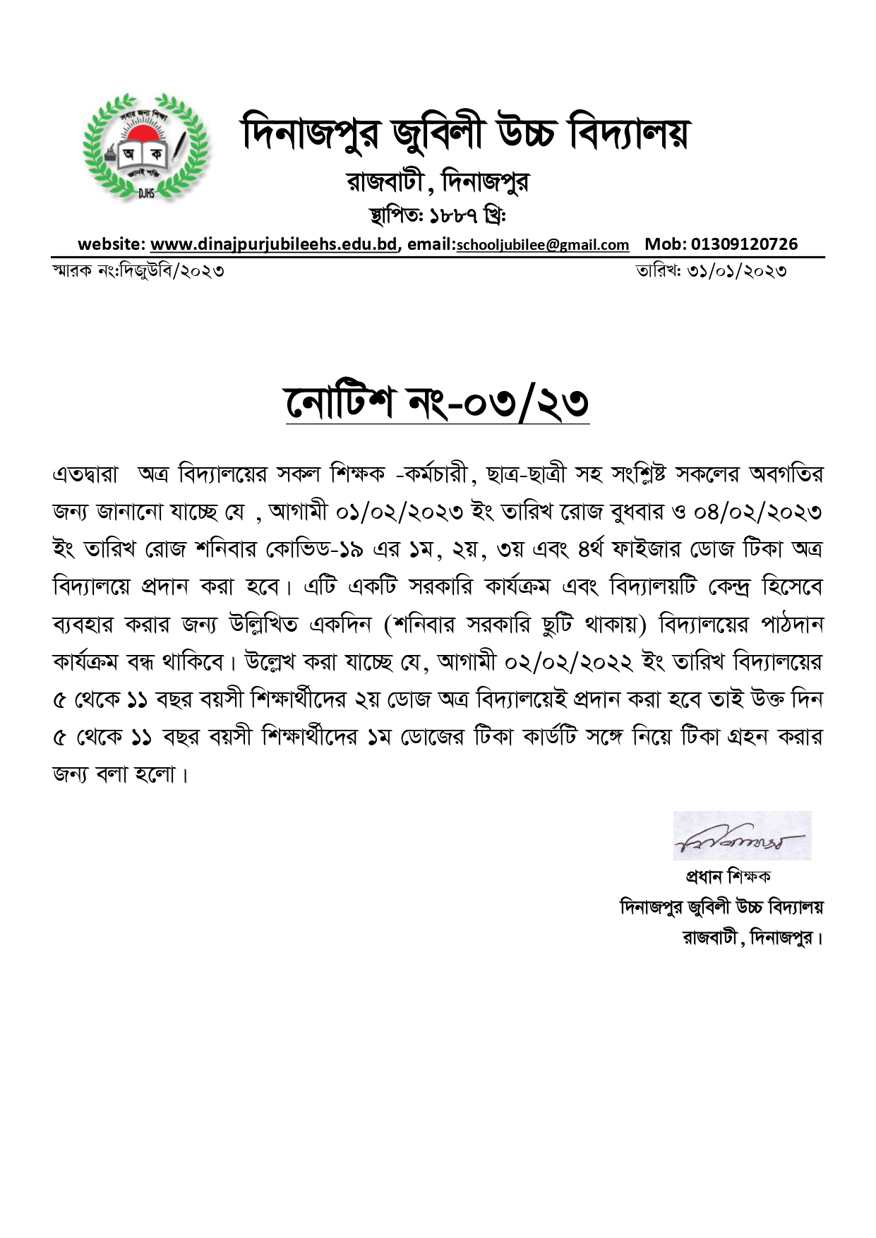 কোভিড-১৯ ভ্যাকসিনেশন ক্যাম্পেইন উদযাপন উপলক্ষ্যে বিদ্যালয়টি কেন্দ্র হিসেবে ব্যবহার প্রসঙ্গে