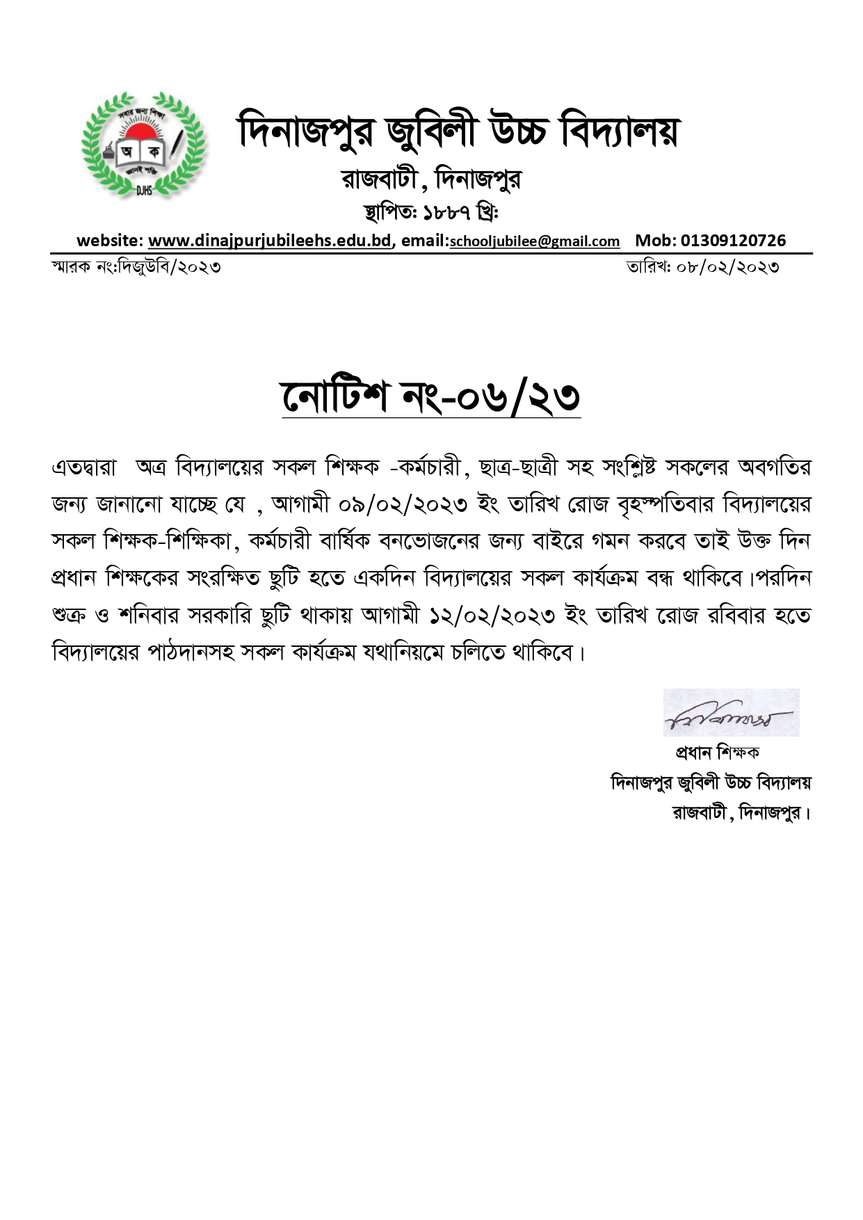 বার্ষিক বনভোজনের জন্য প্রধান শিক্ষকের সংরক্ষিত ছুটি প্রসঙ্গে
