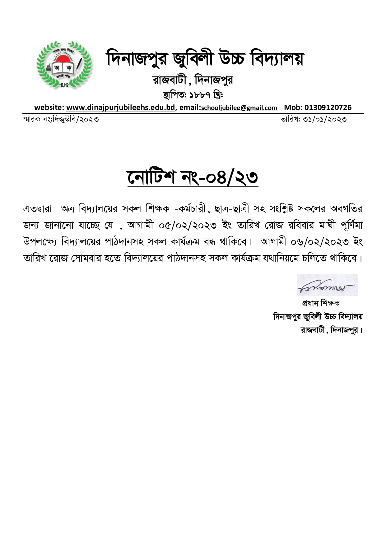 মাঘী পূর্ণিমা উপলক্ষ্যে বিদ্যালয়ের কার্যক্রম বন্ধ প্রসঙ্গে।