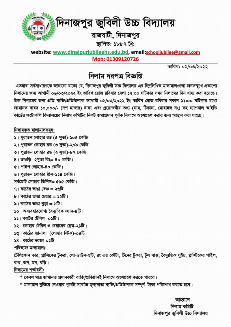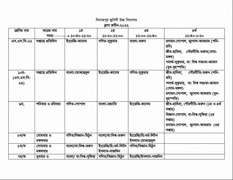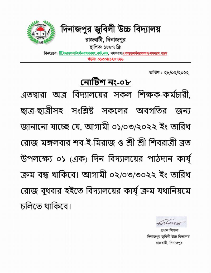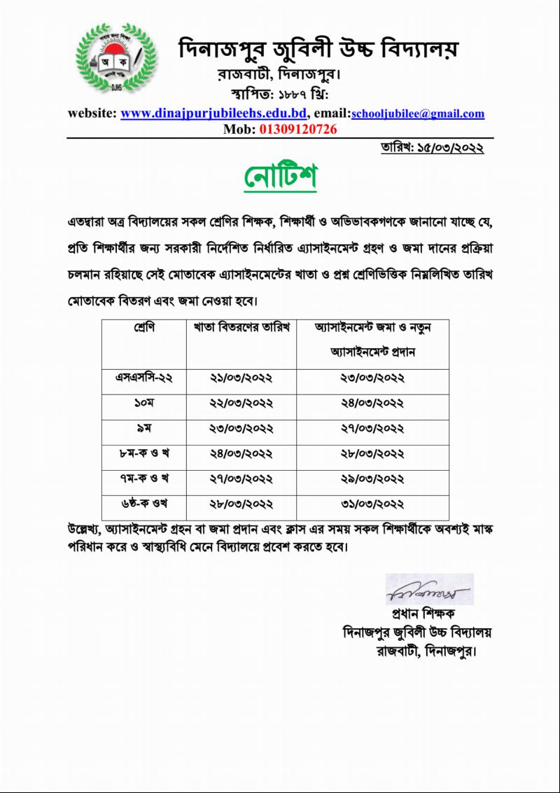 এতদ্বারা দিনাজপুর জুবিলী উচ্চ বিদ্যালয়ের প্রথম হতে দশম শ্রেণীর সকল ছাত্র-ছাত্রী ও 2022 সালের এসএসসি পরীক্ষার্থী ছাত্র-ছাত্রীদেরকে জানানো যাচ্ছে যে আগামীকাল ১৫/০৩/২০২২ তারিখ মঙ্গলবার হতে 10 টা থেকে 4 টা পর্যন্ত একযোগে সকল শ্রেণীর পরিপূর্ণভাবে ক্লাস চলবে। সকল শিক্ষার্থীকে সকাল দশটার মধ্যে স্কুল ড্রেস পরে মুখে মাক্স লাগিয়ে শ্রেণিকক্ষে প্রবেশ করে স্কুলের নিয়ম মেনে ক্লাস করার জন্য নির্দেশ দেওয়া হলো।