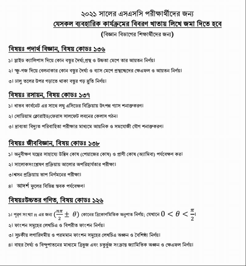 ২০২১ সালের এসএসসি পরীক্ষার্থীদের (বিজ্ঞান বিভাগ) বিষয়ভিত্তিক ব্যবহারিক খাতা তৈরির তালিকা