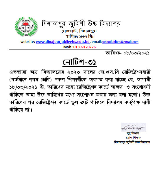 রেজিষ্ট্রেশন কার্ডে স্বাক্ষর ও সংশোধনী সংক্রান্ত নোটিশ (২০২০ সালের জে এস সি রেজিষ্ট্রেশন ধারী বর্তমান নবম শ্রেণির সকল শিক্ষার্থী)