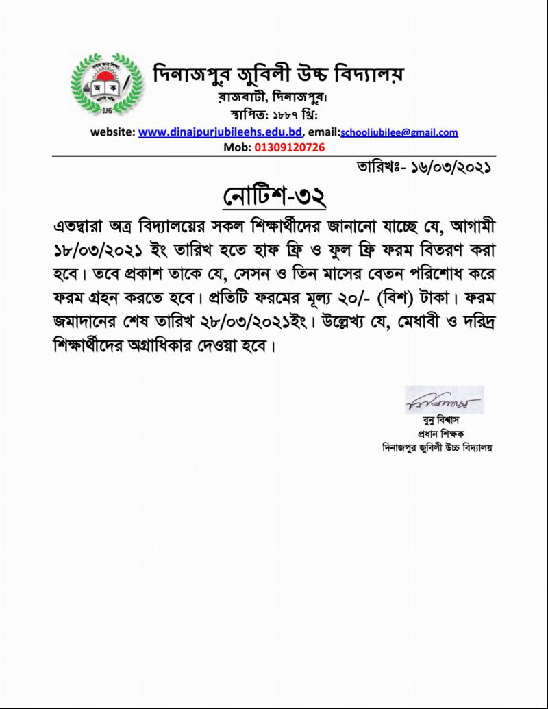 ১৮/০৩/২০২১ ইং তারিখ হতে হাফ ফ্রি ও ফুল ফ্রি ফরম বিতরণ করা হবে