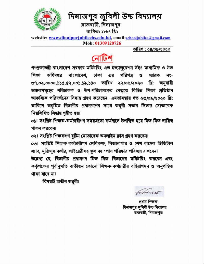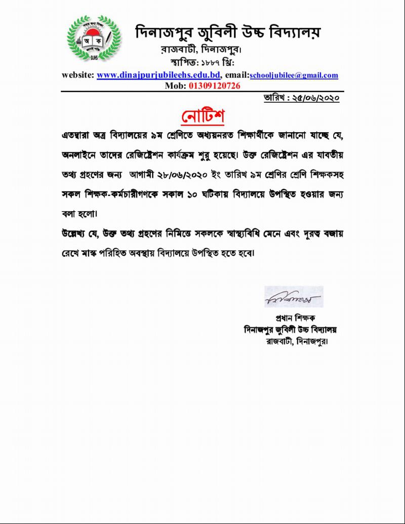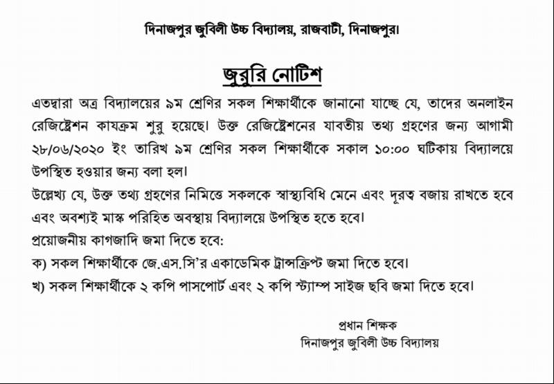 ৯ম শ্রেণির রেজিষ্ট্রেশনের তথ্য প্রদানের জন্য শিক্ষার্থীদের স্বাস্থ্যবিধি মেনে বিদ্যালয়ে উপস্থিত হওয়ার জন্য জরুরি নোটিশ