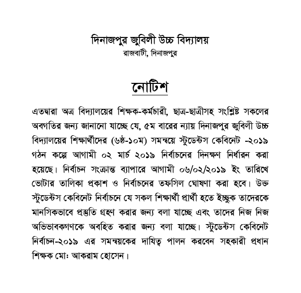 এতদ্বারা অত্র বিদ্যালয়ের সকল শিক্ষক কর্মচারী ও ষষ্ঠ থেকে দশম শ্রেণির সকল শিক্ষার্থীকে জানানো যাচ্ছে যে, আগামী 14/03/2019 ইং তারিখ সকাল 9.০০ ঘটিকা হতে দুপুর 2.00 ঘটিকা পর্য়ন্ত স্টুডেন্ট কেবিনেট নির্বাচন অনুষ্ঠিত হবে। উক্ত নির্বাচনে শিক্ষার্থীরা যথাসময়ে উপস্থিত থেকে তাদের ভোটাধিকার প্রয়োগের মধ্য দিয়ে পছন্দের প্রার্থীকে নির্বাচিত করার জন্য বলা হল। একই সঙ্গে উক্ত নির্বাচন সুষ্ঠুভাবে সম্পন্নের জন্য সকল শিক্ষক ও কর্মচারীকে সজাগ দৃষ্টি এবং সহযোগিতা করার জন্য নির্দেশক্রমে অনুরোধ করা হলো।