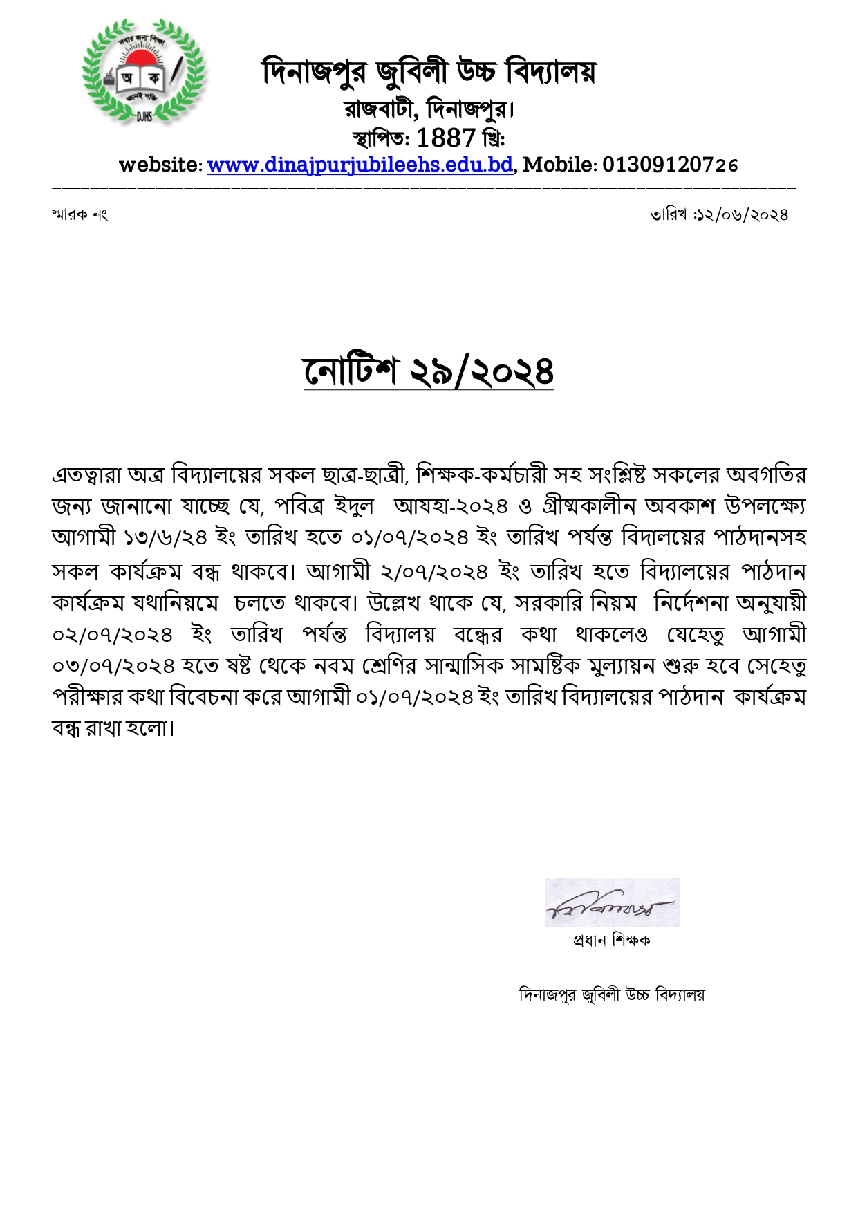 পবিত্র ঈদ-উল-আযহা এবং গ্রীষ্মকালীন অবকাশ বন্ধ প্রসঙ্গে
