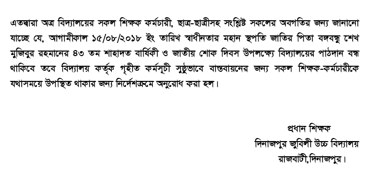 ১৫-৮-২০১৮ ইং তারিখ বিদ্যালয়ের পাঠদান বন্ধ ও জাতীয় শোক দিবস উজ্জাপন উপলক্ষে নোটিশ