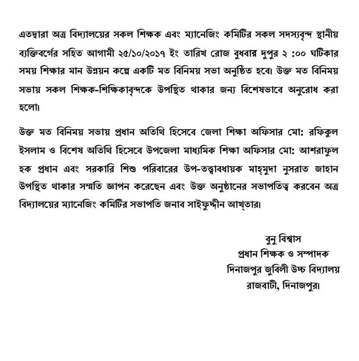 দিনাজপুর জুবিলী উচ্চ বিদ্যালয়ে ভর্তি কার্যক্রম শুরু হয়েছে। আসন্ন ২০১৮ শিক্ষাবর্ষের ভর্তিচ্ছু ১ম হতে ৯ম শ্রেণি পর্যন্ত নতুন শিক্ষার্থীদের ভর্তি ফরম বিতরণ আগামী ১৭/১২/২০১৭ ইং তারিখ হতে ০৪/০১/২০১৮ ইং তারিখ পর্যন্ত চলবে। ভর্তি ফরম জমাদান আগামী ২০/১২/২০১৭ ইং তারিখ হতে ০৪/০১/২০১৭ ইং তারিখ পর্যন্ত চলবে।